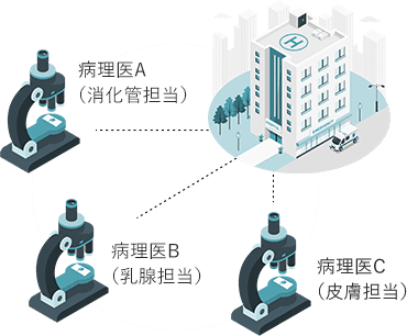 複数の病理医(病理診断科クリニック)と連携することで、消化管、乳腺、皮膚など、各領域に精通した病理医へ病理診断を依頼することが可能です。